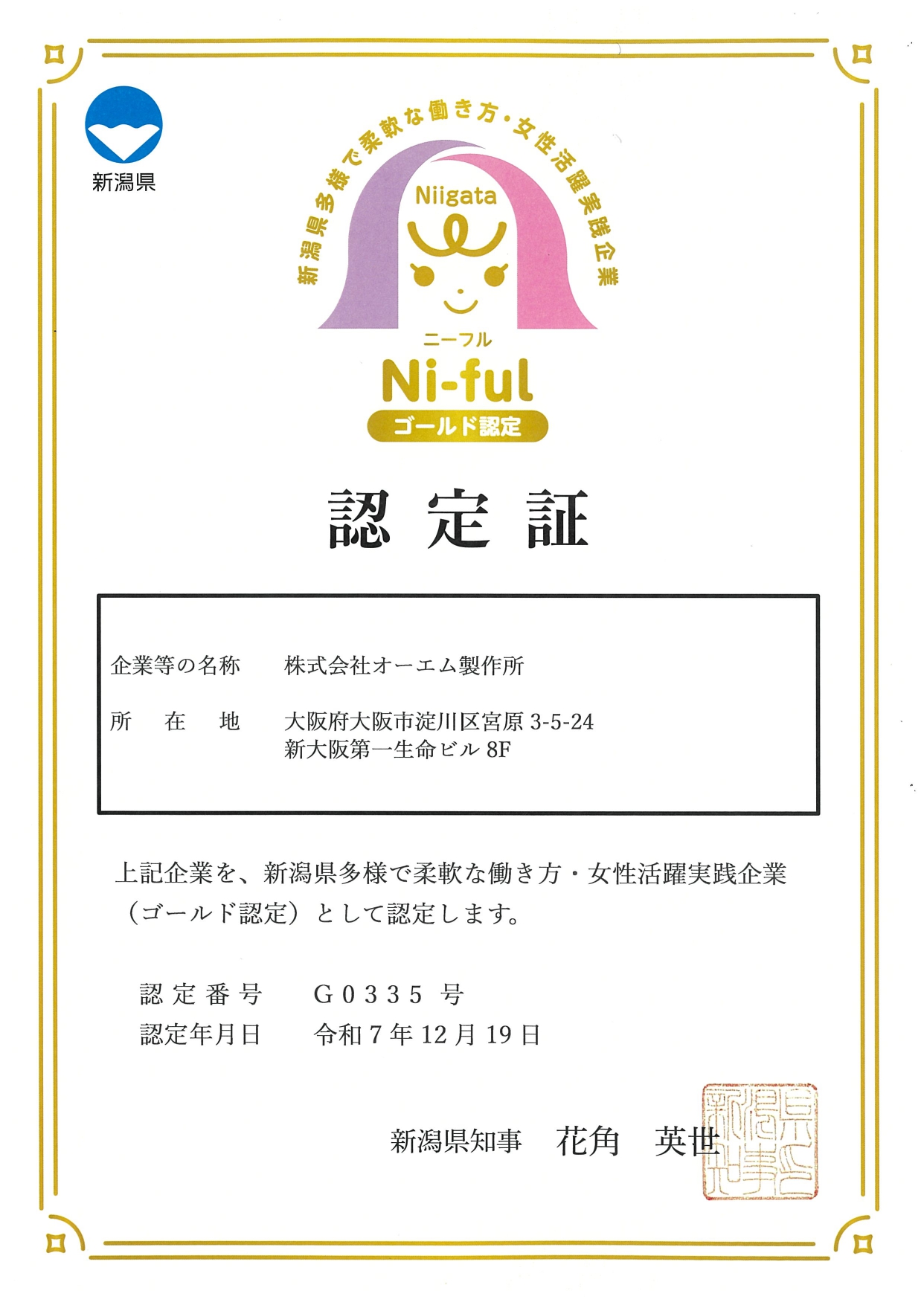 新潟県で多様で柔軟な働き方、仕事と家庭との両立支援、女性登用・活躍に積極的に取り組む企業を認定するNi-ful(ニーフル)制度にてオーエム製作所が「Ni-fulゴールド企業」の認定をいただきました。