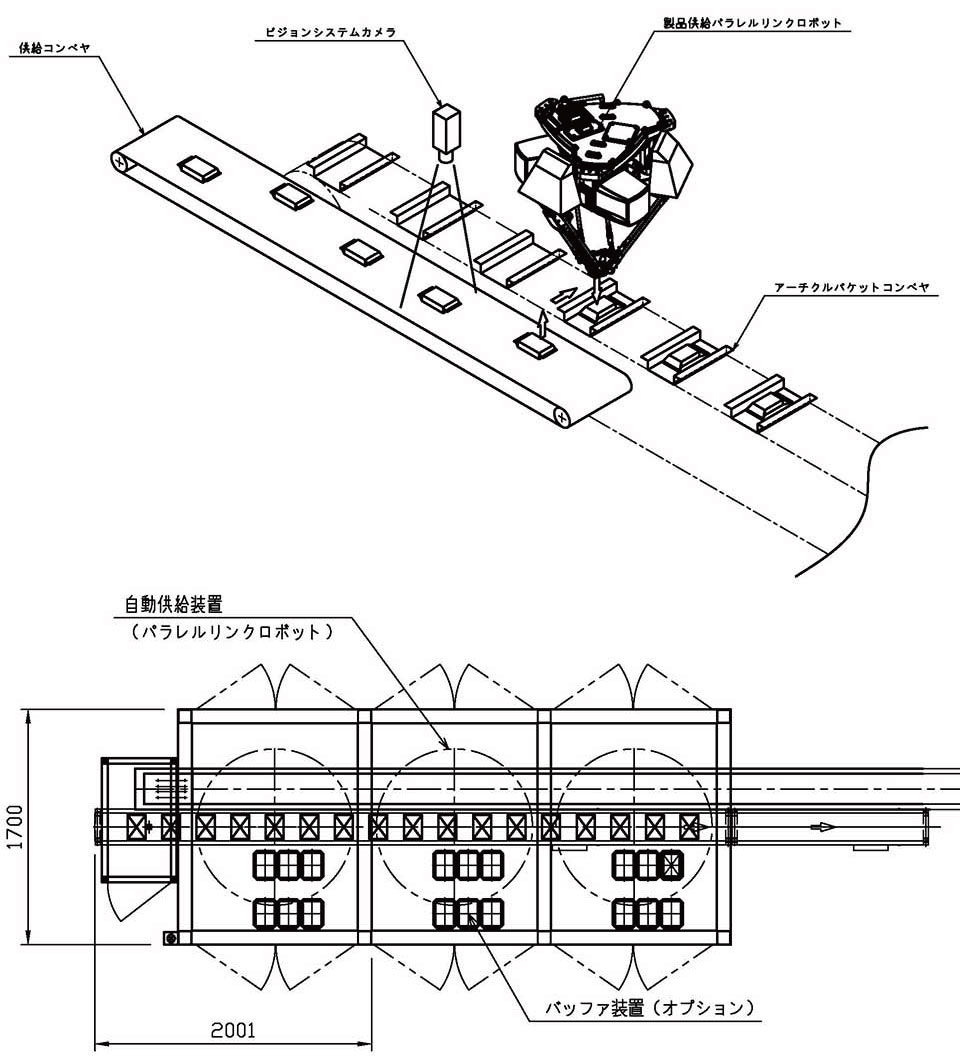1.上流工程よりランダム搬送されてくる製品をロボットによりピックアップし、連続搬送するカートナーバケットへ同期しながら供給します。| 本体能力 |