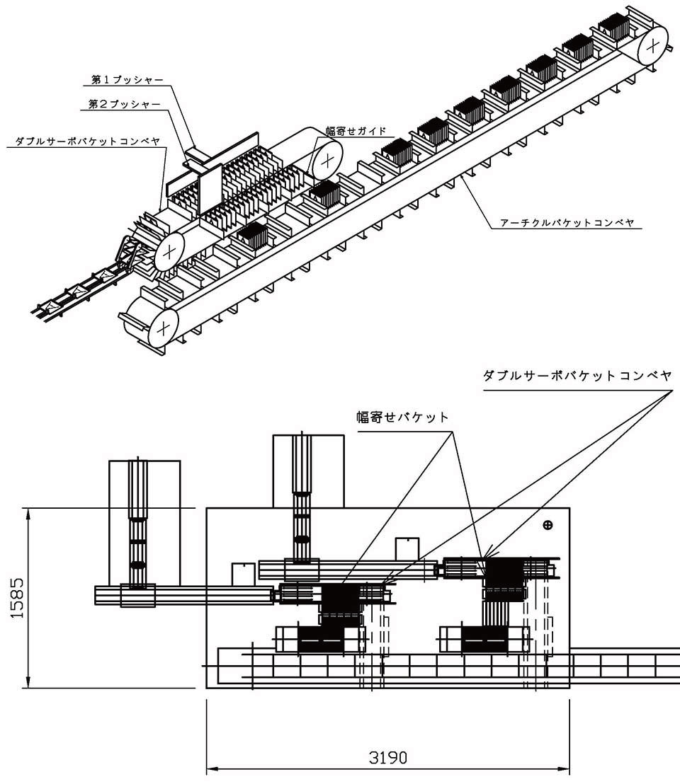 1.上流工程より搬送されてくる製品をダブルサーボ駆動のバケットコンベヤに受渡し、製品を倒立させた状態で複数個集積し、カートナーへ供給します。| 本体能力 |