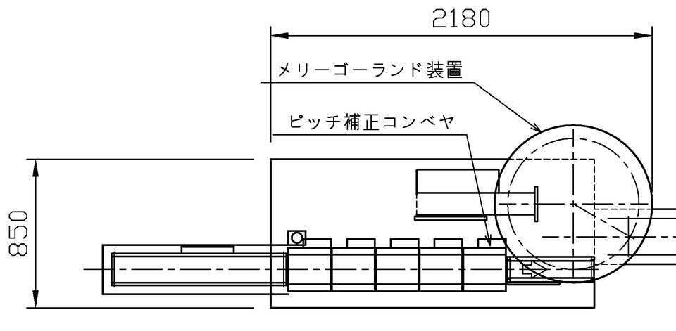 1.ランダムピッチで搬送されてくる製品を単独ザーボ駆動のピッチ補正コンベヤにより、ピッチ及び供給タイミングを補正し、メリーゴーランド装置でピックアップし、連続搬送するカートナーバケットへ供給します。| 本体能力 |