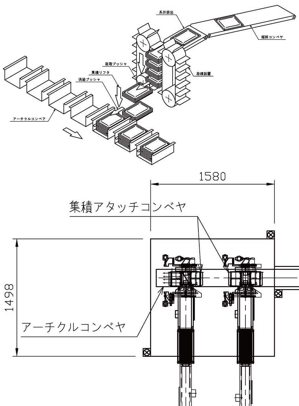 1.ランダムピッチで搬送されてくる製品を、2連式ダブルサーボ駆動のアタッチコンベヤにて複数個集積し、カートナー本体に供給します。| 本体能力 |